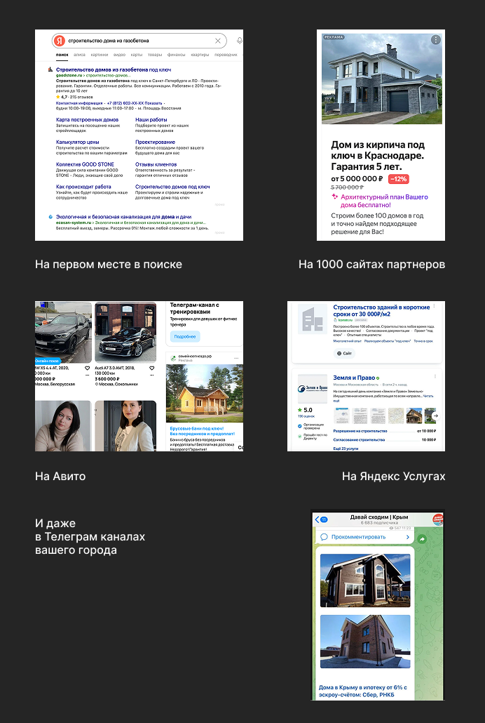 Рекламные объявления работают в связке с сайтом: мы тестируем разные форматы заголовков и предложений, чтобы находить то, что цепляет именно в вашем регионе. Клиенты видят нашу рекламу везде ↓